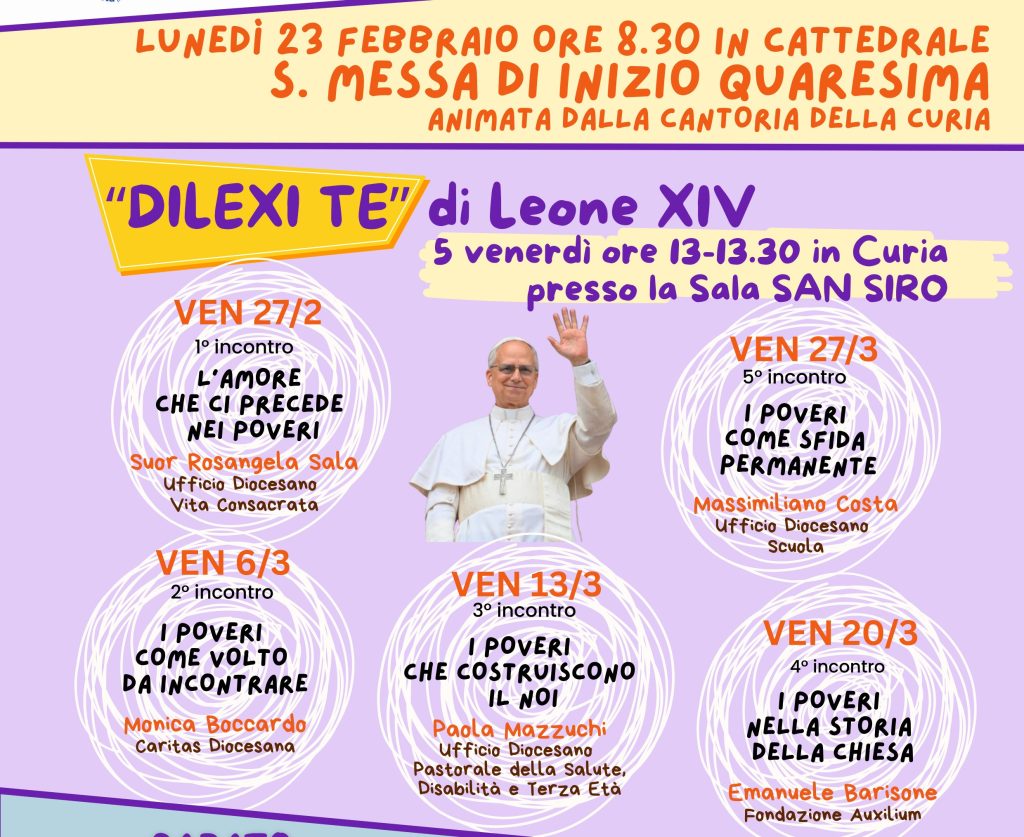 Lunedì 23 febbraio alle ore 8.30 in Cattedrale Mons. Marco Tasca celebra la S. Messa di inizio Quaresima per il personale della Curia e dei Servizi Diocesani. La celebrazione sarà animata dalla Cantoria della Curia. Quest’anno inoltre, nei 5 venerdì di Quaresima, è stato predisposto un cammino di riflessione sull’Esortazione Apostolica “Dilexi te” di Papa Leone XIV, dedicata all’amore verso… leggi »