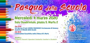 A motivo dell’emergenza sanitaria, il programmato incontro di Mercoledì 4 marzo 2020 alla Sala Quadrivium “Pasqua della Scuola” rivolto a Dirigenti, Docenti, Operatori Scolastici, Genitori e Studenti con il Cardinale Angelo Bagnasco è stato ANNULLATO. leggi »
