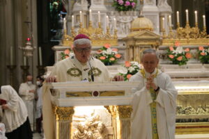 La celebrazione della S. Messa è stata presieduta da Mons. Marco Tasca, presenti Mons. Martino Canessa, Vescovo emerito di Tortona, Mons. Nicolò Anselmi, Vescovo Ausiliare, Mons. Marco Doldi, Vicario Generale, i Vicari Episcopali, Mons. Marco Granara, Rettore del Santuario, i presbiteri e i diaconi operanti nella Chiesa genovese, i seminaristi con i loro superiori e molti fedeli laici.