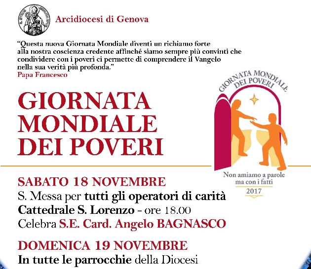 Il 19 novembre prossimo, XXXIII Domenica del Tempo Ordinario, la Chiesa celebra la prima Giornata Mondiale dei Poveri. “Questa nuova Giornata Mondiale – scrive Papa Francesco nel Messaggio che la annuncia, dal titolo ‘Non amiamo a parole ma con i fatti’ – diventi un richiamo forte alla nostra coscienza credente affinché siamo sempre più convinti che condividere con i poveri ci permette di comprendere il Vangelo nella sua verità più profonda.” In Diocesi la Giornata sarà celebrata in tutte le parrocchie. In particolare, già sabato 18 Novembre, due momenti segneranno l’avvio della Giornata, alla presenza dell’Arcivescovo, il Card. Angelo Bagnasco.