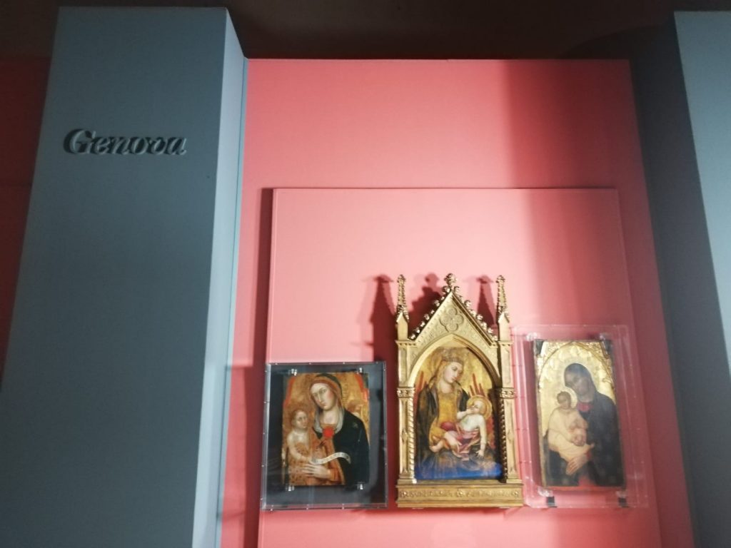 La mostra di Perugia accoglie il suo capolavoro genovese, la piccola tavola rimanente della Madonna con Bambino, dipinta per l’altare maggiore della Chiesa di Santa Maria delle Vigne negli anni 1397-1398, parte di un trittico nel quale l’immagine della Madonna doveva essere posta al centro, circondata da una poderosa corte di angeli, dei quali rimangono tracce nelle aureole tagliate poste ai bordi. La pala fu nei secoli successivi smembrata e occultata, per essere riscoperta