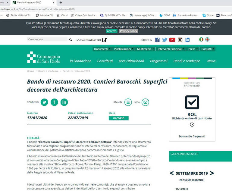 L’Ufficio Beni Culturali informa che è uscito un bando della Compagnia di San Paolo per il restauro delle superfici decorate dell’architettura di epoca barocca (dipinti murali e stucchi) ubicati in edifici nel territorio piemontese e ligure con comprovata datazione del bene fra il 1600 e il 1770.