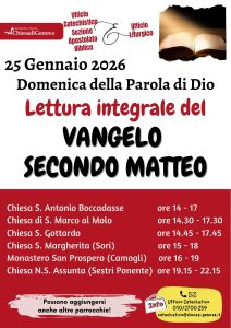 Per questa occasione l’Ufficio Catechistico – Sezione Apostolato biblico propone la lettura integrale del Vangelo secondo Matteo in alcune chiese della Diocesi.
