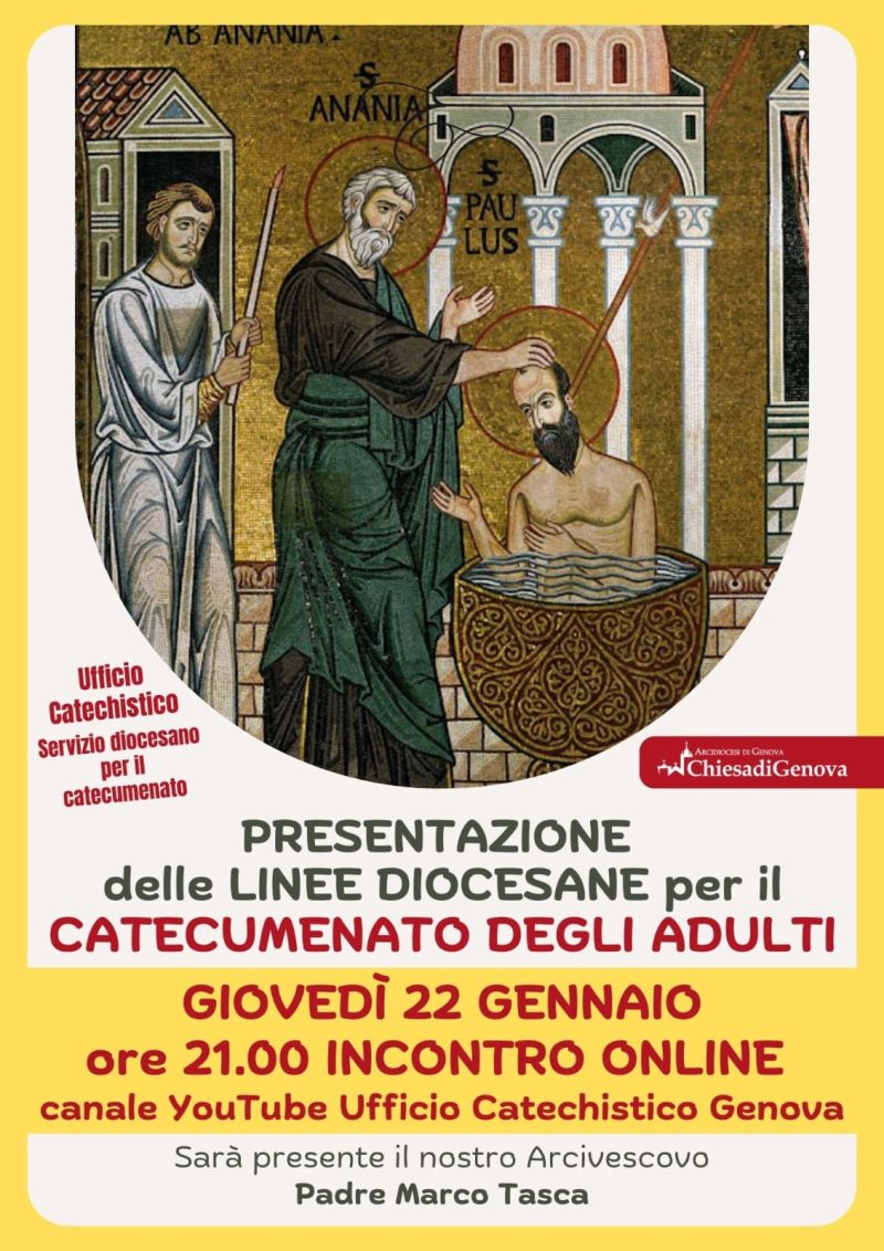 Dobbiamo rifletterci, leggere, studiare e condividere su questa grande chance che troppo spesso abbiamo sprecato. Avremo altre occasioni per riflettere insieme su questa priorità per le nostre parrocchie. Il primo appuntamento sarà GIOVEDI’ 22 GENNAIO alle ore 21,00 sul canale you tube dell’ufficio catechistico di Genova. Molto semplicemente, con il contributo dell’Equipe del Servizio Diocesano per il Catecumenato degli Adulti presenteremo le Linee Diocesane. Sarà presente anche il nostro vescovo Marco. Potremo poi rivedere il video anche in momenti diversi. Tuttavia, in diretta si potranno anche fare domande sulla chat.