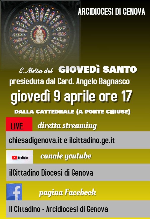 9 Aprile 20209 Aprile 2020Notizie9 aprile 2020: trasmissione della celebrazione del Giovedì Santo sui nostri canali Giovedì 9 aprile 2020 alle ore 17 il Cardinale Angelo Bagnasco celebra in Cattedrale a porte chiuse la celebrazione del Giovedì Santo. Ecco come seguirla: condividi su