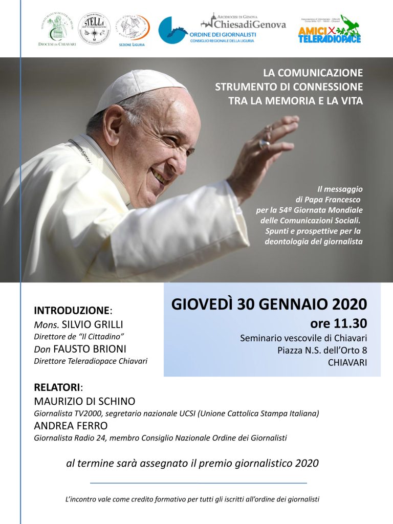Giovedì 30 gennaio alle ore 11.30 nel Seminario vescovile di Chiavari (P.zza N.S. dell’Orto 8) per i festeggiamenti in onore di San Francesco di Sales, patrono dei giornalisti, si terrà l’incontro “La comunicazione strumento di connessione tra la memoria e la vita”. Il messaggio di papa Francesco per la 54esima Giornata Mondiale per le Comunicazioni Sociali.