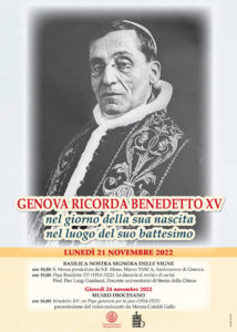 Infine, giovedì 24 novembre alle ore 16 nel Museo Diocesano viene presentato il video realizzato dalla Dott. Marzia Cataldi Gallo “Benedetto XV; un Papa genovese per la pace”.