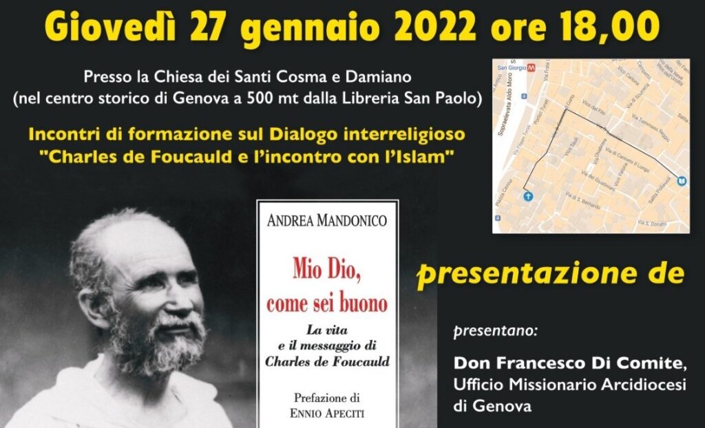 Giovedì 27 gennaio alle ore 18 nella chiesa dei Santi Cosma e Damiano in Centro Storico è in programma la presentazione del volume di Andrea Mandonico “Mio Dio, come sei buono. La vita e il messaggio di Charles de Foucauld”.