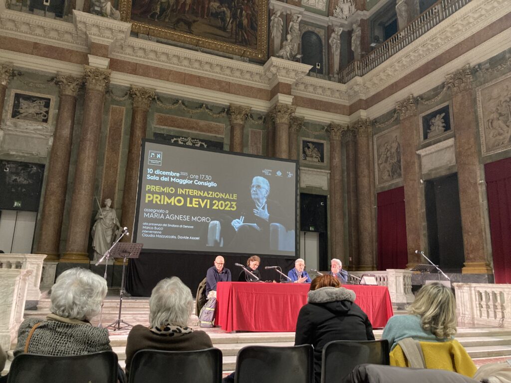 Alla presenza del Sindaco di Genova Marco Bucci e del Presidente del Centro Culturale Primo Levi Alberto Rizzerio, nella cornice della Sala del Maggior Consiglio di Palazzo Ducale, domenica 10 dicembre è avvenuta la consegna del Premio Internazionale Primo Levi a Maria Agnese Moro per il suo impegno nell’ambito della giustizia riparativa. Sono intervenuti nella cerimonia Davide Assael presidente dall’associazione Lech Lechà e Claudia Mazzucato docente dell’Università Cattolica del Sacro Cuore.