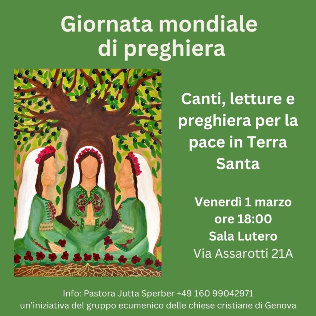 Venerdì 1 marzo 2024, in occasione della Giornata mondiale di Preghiera, alle ore 18 nella Sala Lutero in Via Assarotti 21A si svolge un momento di preghiera con canti, letture e preghiera per la pace in Terra Santa. L’iniziativa è del gruppo ecumenico delle chiese cristiane di Genova.
