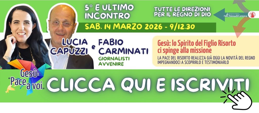 Sabato 14 febbraio 2026, dalle 9 alle 12.30, quarto incontro della Formazione Diocesana permanente e per tutti dal titolo “Gesù: Pace a voi“, edizione 2025/2026. L’iscrizione, come sempre, avviene tramite il form dedicato. Per ogni informazione e aiuto è possibile scrivere alla mail: formazione@diocesi.genova.it. Il tema “Gesù: nel Figlio diveniamo fratelli di… leggi »