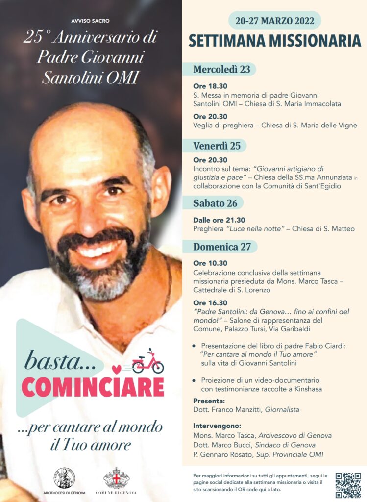 Si svolge a Genova dal 20 al 27 marzo 2022 la Settimana missionaria per ricordare la figura di padre Giovanni Santolini, missionario Oblato di Maria Immacolata morto tragicamente a Kinshasa (Repubblica democratica del Congo) il 23 marzo 1997.