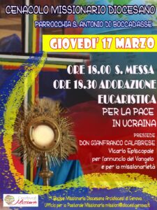 alle ore 18.00 S. Messa; alle ore 18.30 Adorazione eucaristica per la pace in Ucraina presieduta da don Gianfranco Calabrese, Vicario episcopale per l’annuncio del Vangelo e per la missionarietà.