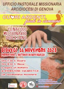 L’ufficio missionario diocesano organizza per il Cenacolo Missionario la preghiera nella parrocchia S. Antonio di Boccadasse per giovedì 16 novembre 2023.