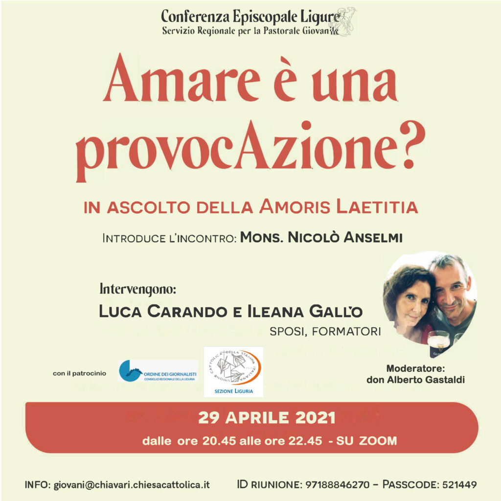 Il primo appuntamento dal titolo ‘Amare è una provocAzione’ è giovedì 29 aprile alle ore 20.45 sulla piattaforma zoom; l’incontro è moderato da don Alberto Gastaldi; interverranno Ileana Gallo e Luca Carando, coppia di sposi formatori.