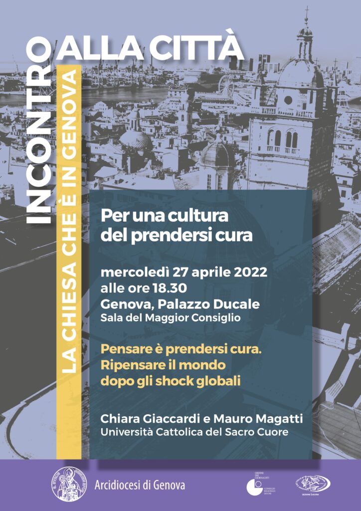 Il primo appuntamento sarà mercoledì 27 aprile 2022 alle ore 18.30 nel Salone del Maggior Consiglio di Palazzo Ducale e vedrà relatori sul tema del ‘prendersi cura’ Chiara Giaccardi, docente di Sociologia dei Processi Culturali e Comunicativi e Mauro Magatti, docente di Sociologia Generale.