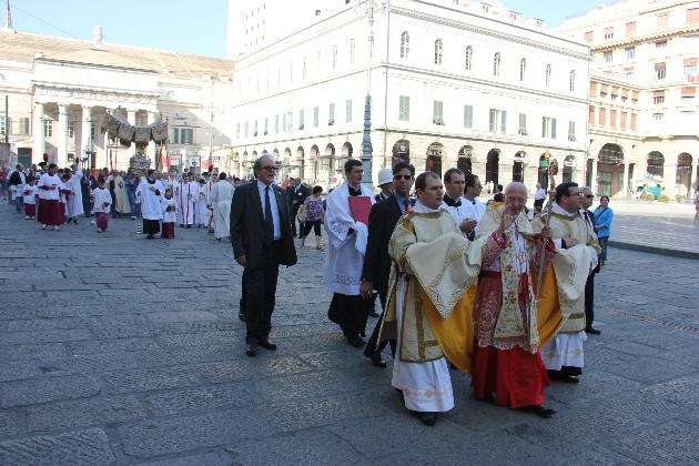 Si è svolta sabato 21 giugno la tradizionale processione del Corpus Domini presieduta dall’Arcivescovo. Dopo il canto dei vespri solenni, la processione della restaurata Arca con la Santa Eucaristia portata a braccia, è partita dalla chiesa di San Siro nel Centro Storico e, partecipata da sacerdoti, religiosi, religiose, associazioni, movimenti, istituzioni, forze armate e molti fedeli, ha concluso il suo percorso in Cattedrale dopo aver percorso Via Garibaldi, Via XXV Aprile, Piazza De Ferrarri e Via San Lorenzo. La processione è passata davanti a Palazzo Tursi e ad accoglierla è stato, in rappresentanza del Sindaco Marco Doria, il presidente del Consiglio comunale Giorgio Guerello.