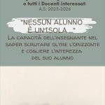 Il Corso di Aggiornamento per l’a.s. 2025-2026 avrà come tema “NESSUN ALUNNO È UN’ISOLA …” La capacità dell’insegnante nel saper scrutare oltre l’orizzonte e cogliere l’interezza del suo alunno. e sarà strutturato in 5 incontri di aggiornamento specifici per gli insegnanti, che verranno integrati da 5 incontri formativi trasversali organizzati dalla diocesi, che si terranno il sabato mattina. Gli incontri… leggi »