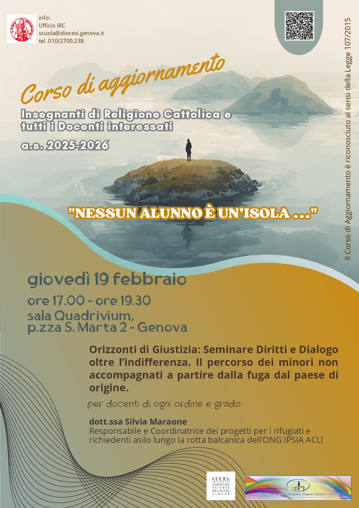 Giovedì 19 febbraio alle ore 17 alla Sala Quadrivium, per il Corso di aggiornamento degli insegnanti di religione e tutti i docenti interessati, si svolge l’incontro per docenti di ogni ordine e grado sul tema “Orizzonti di Giustizia: Seminare Diritti e Dialogo oltre l’indifferenza. Il percorso dei minori non accompagnati a partire dalla fuga dal paese di origine.“