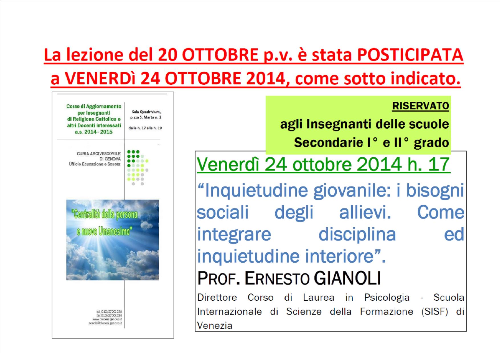 La lezione del Corso di Aggiornamento I.R.C. a.s. 2014/15 del Prof. Ernesto Gianoli, riservato alle scuole secondarie di I° e II° grado, che avrebbe dovuto svolgersi lunedì 20 ottobre p.v. è stata posticipata a venerdì 24 ottobre 2014, sempre con sede al Quadrivium, sempre alle ore 17.