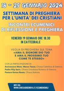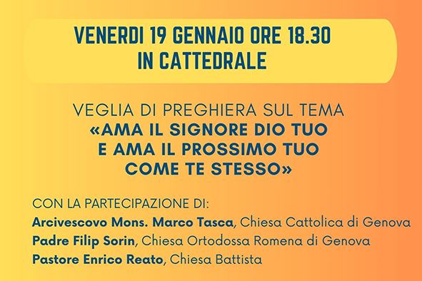 Nell’ambito della Settimana di preghiera per l’unità dei cristiani, venerdì 19 gennaio alle ore 18.30 in Cattedrale si svolgerà la Veglia ecumenica di preghiera a cui parteciperanno, insieme all’Arcivescovo Mons. Marco Tasca, i rappresentanti delle professioni di fede cristiana presenti nella nostra città. La Veglia, come tutta la settimana, sarà incentrata sul tema tratto dalla parabola detta del “buon samaritano”: “Ama il Signore Dio tuo e ama il prossimo tuo come te stesso”. La preghiera sarà arricchita dalla spiegazione di un’Icona rappresentante il brano di Luca 10, 25-37 e la testimonianza del servizio svolto nelle carceri dall’Associazione “Gli amici di Zaccheo”.