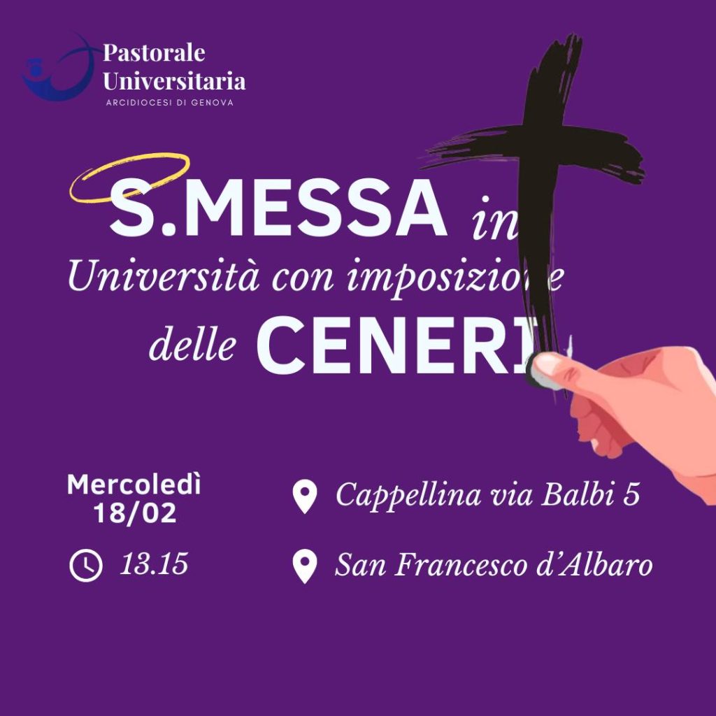 La Pastorale Universitaria dell’Arcidiocesi di Genova invita studenti, docenti e personale universitario alla Santa Messa con imposizione delle Ceneri, che si terrà mercoledì 18 febbraio alle ore 13.15.