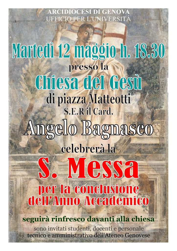 Martedì 12 maggio alle ore 18.30 presso la Chiesa del Gesù (Piazza Matteotti) S.E.R. il Cardinale Angelo Bagnasco celebrerà la Santa Messa per la conclusione dell’Anno Accademico.