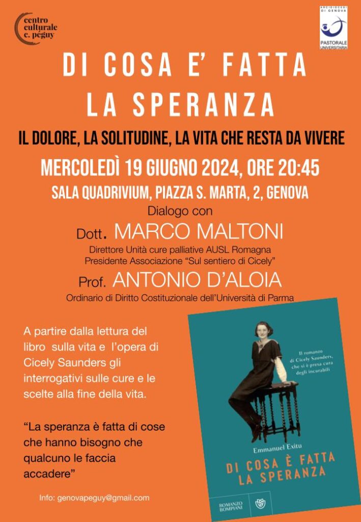 Il Centro culturale Charles Péguy, insieme all’Ufficio per la Pastorale Universitaria dell’Arcidiocesi di Genova, a partire dalla lettura del libro di Emmanuel Exitu “Di cosa è fatta la speranza” sulla vita e l’opera di Cicely Saunders, offre una riflessione e un dialogo confrontandosi con gli attuali interrogativi sulle cure e sulle scelte alla fine della vita.