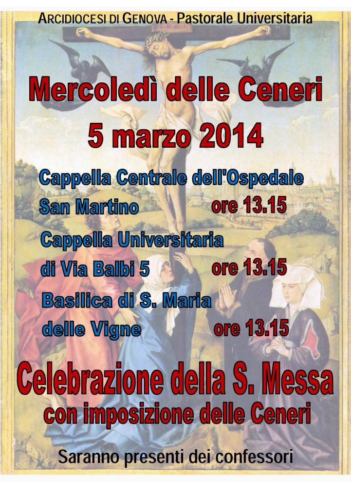 Cappella Universitaria Via Balbi 5, Cappella DIMI presso Ospedale San Martino e Basilica di S. Maria delle Vigne: Celebrazione Santa Messa alle ore 13.15 con imposizione delle ceneri.Sono invitati a partecipare Docenti Universitari, Studenti, Personale Tecnico e Personale AmministrativoSaranno presenti e disponibili confessori.