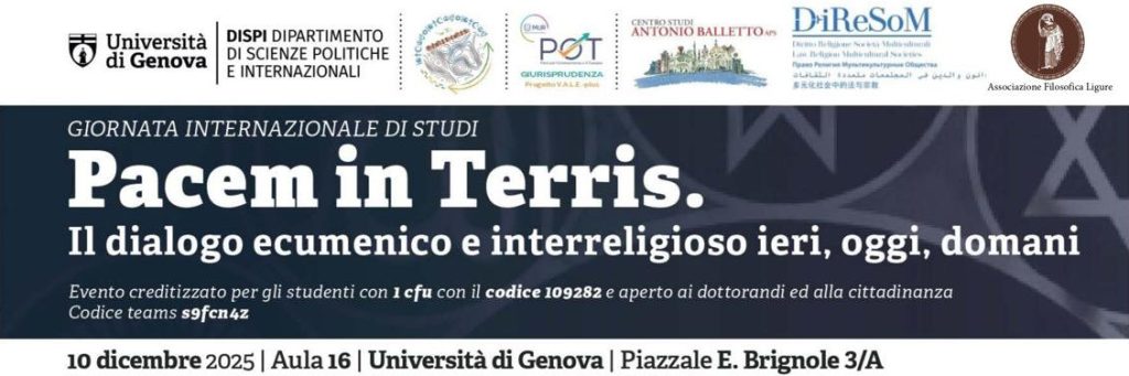 Mercoledì 10 dicembre 2025 all’Università di Genova (Aula 16, Albergo dei Poveri, Piazzale E. Brignole 3a) si svolge la Giornata Internazionale di Studi Interdisciplinari: Pacem in Terris. Il dialogo ecumenico e interreligioso ieri, oggi, domani.