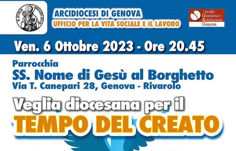 A cura dell’Ufficio diocesano per la vita sociale e il lavoro, con il Tavolo Giustizia e Solidarietà di Genova, nel Tempo del Creato è in programma la Veglia diocesana “Facciamo pace con il Creato. Per costruire un mondo di giustizia per tutti”, venerdì 6 ottobre alle ore 20.45 nella chiesa del SS. Nome di Gesù al Borghetto (Via Canepari 28 a Rivarolo).