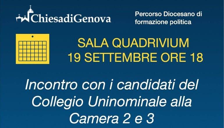 Lunedì 19 settembre 2022, nell’ambito del Percorso diocesano di formazione politica coordinato da don Massimiliano Moretti, è in programma presso i locali del Seminario (Salita Cavallo, 104) alle ore 18 l’incontro ‘Verso le elezioni politiche’ con i candidati del Collegio Uninominale alla Camera 2 e 3.