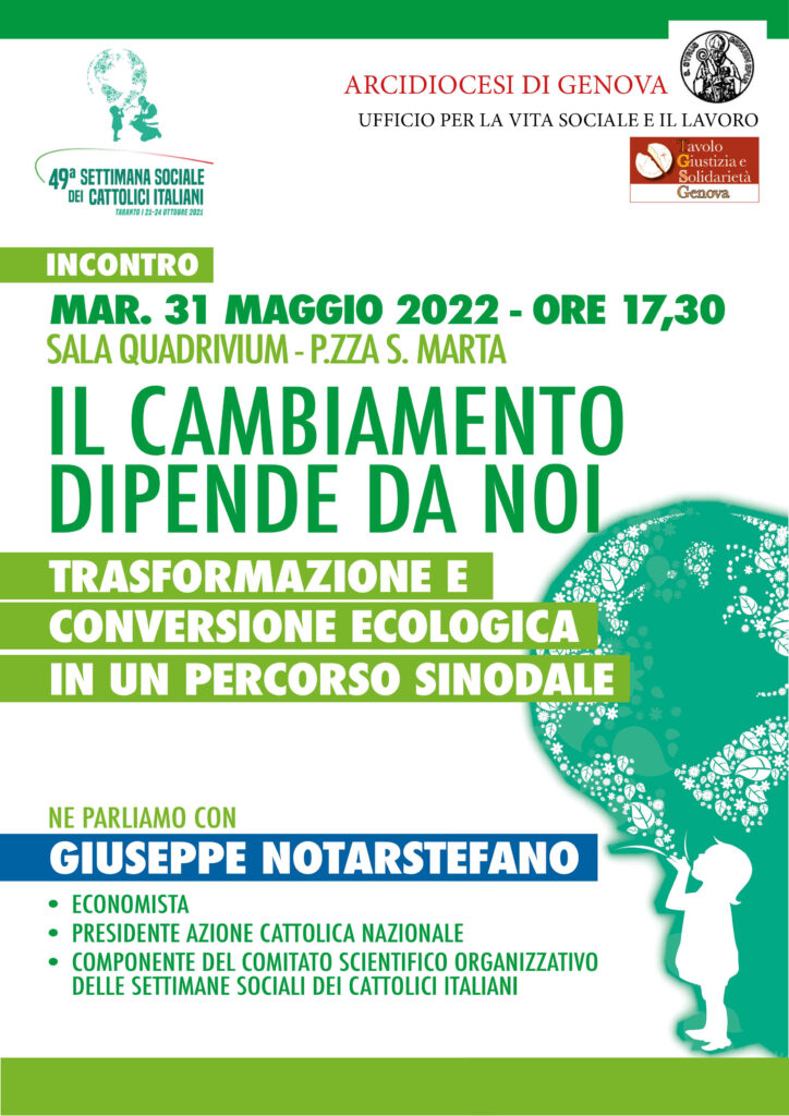 Martedì 31 maggio (ore 17,30, Sala Quadrivium) il Tavolo Giustizia e Solidarietà Genova promuove l’incontro “Il cambiamento dipende da noi: trasformazione e conversione ecologica in un percorso sinodale”: partecipa il presidente nazionale dell’Azione Cattolica Italiana, Giuseppe Notarstefano, economista e componente del comitato scientifico organizzativo delle Settimane Sociali dei Cattolici italiani.