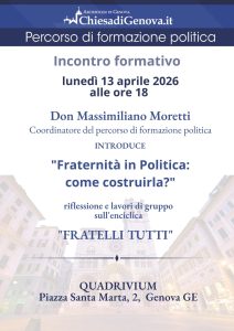 Prosegue il percorso di formazione politica promosso dall’Arcidiocesi di Genova, con un nuovo appuntamento in programma lunedì 13 aprile 2026 alle ore 18 alla Sala Quadrivium.