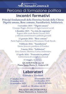 28 Ottobre 2025NotiziePercorso diocesano di formazione politica: il calendario degli incontri e dei laboratori per l’anno 2025-2026 È disponibile il calendario del Percorso diocesano di formazione politica per l’anno 2025-2026. condividi su