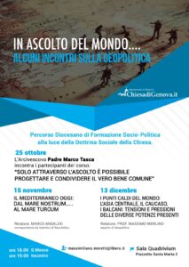 Lunedì 15 novembre “Il Mediterraneo oggi: dal mare nostrum… al mare turcum”, relatore Marco Ansaldo, corrispondente da Instanbul per La Repubblica; lunedì 13 dicembre “I punti caldi del mondo: l’Asia centrale, il Caucaso, i Balcani: tensioni e pressioni delle diverse potenze presenti”, relatore prof. Massimo Merlino, esperto di Geopolitica.