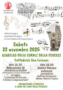 Giubileo dei Cori e delle Corali sabato 22 Novembre Descrizione: Giubileo dei Cori e delle Corali (Roma, fino al 23). Evento giubilare diocesano (Cattedrale, ore 16.30); Inizio: 22/11/2025 16:00 Fine: 22/11/2025 18:00 Categorie: Eventi, Genova e il Giubileo 2025 Città: Genova Regione: Liguria Paese: Italia condividi su
