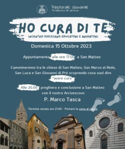 Incontro diocesano educatori e aiuto educatori domenica 15 Ottobre Descrizione: In piazza San Matteo Incontro educatori e aiuto educatori di tutte le Associazioni, Movimenti, Parrocchie (a cura della Pastorale Giovanile) Inizio: 15/10/2023 17:00 Fine: 15/10/2023 21:00 Categorie: Appuntamenti diocesani Città: Genova Regione: Liguria Paese: Italia condividi su